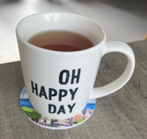 De tekst op deze mok – ‘oh happy day’ – doet me denken aan het geluk van kleine overwinningen. Een nieuw inzicht, een frisse blik, of gewoon dat gevoel: we gaan vooruit!