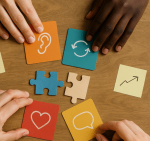 Dit beeld sluit voor mij aan op de lerende organisatie, waarin alle stukjes samenkomen. Niet alleen leren uit boeken en van theorie, maar ook door samen in actie te komen en de handen uit de mouwen te steken. Leren en verbeteren als voortdurende beweging in de praktijk, waarbij de ervaringen van zorgvragers/ervaringsdeskundigen worden gehoord én meegenomen.